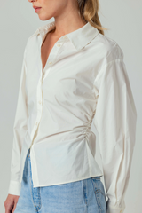 A signature Sundays update to the classic white poplin button-up. Zariah features flattering side-body ruching for a feminine, sculpted silhouette, contrasted by voluminous sleeves for a modern sense of ease. This top is slimming and considered true to size. The length will finish just waist the waistband of most wearer's favorite mid-rise jeans.